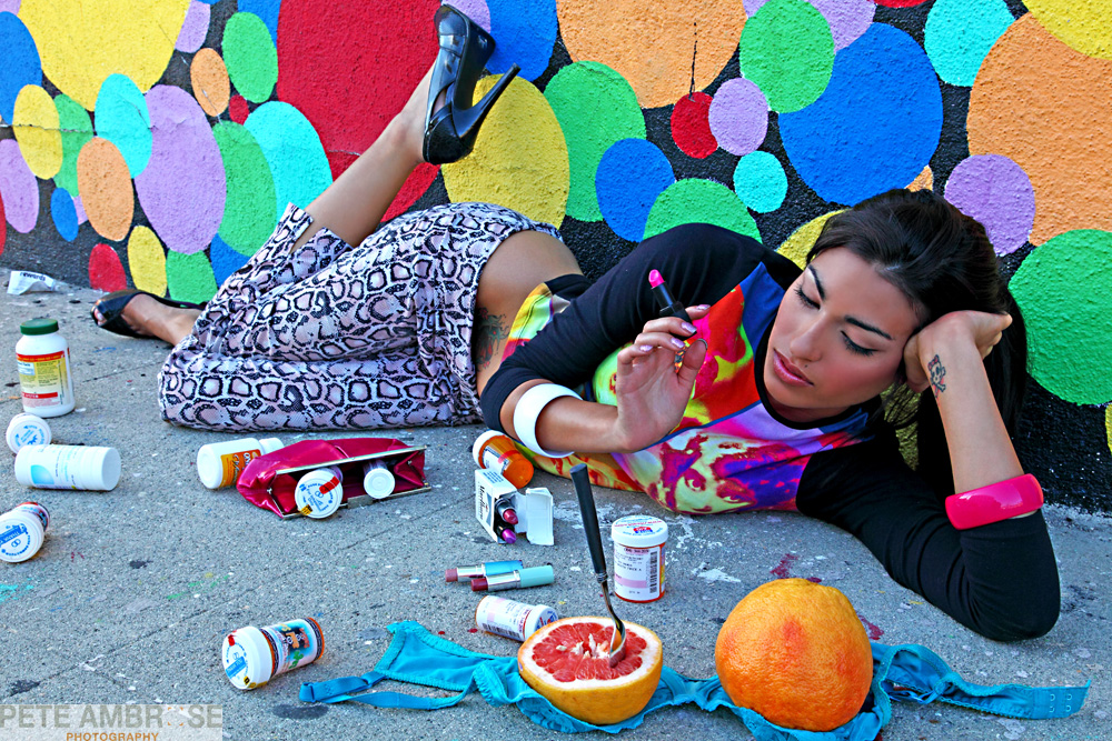 This sub-series of mixed media diptychs aim to reinvent the potential for studio fashion photography on multiple levels. A base concept is set out to be realized tackling universal sociological conflict that both stirs and dictates progress within society and fashion itself. Set upon an incongruent canvas of complimentary design and pattern, the model is the artistically placed upon and contorted in an energetic and emotive pose. She becomes only one aspect of the piece as she is surrounded by objects that support the overall theme and formal aesthetics of the canvas. Creating the diptych is more of a snarky reference to the listless studio fashion editorials, further supported by the goodwill wardrobe adorning the model antithetically to its intended use, i.e. skirts become shirts, socks become skirts, pants become tops. What is the intent of clothing’s use if to be nothing else but fashionable?